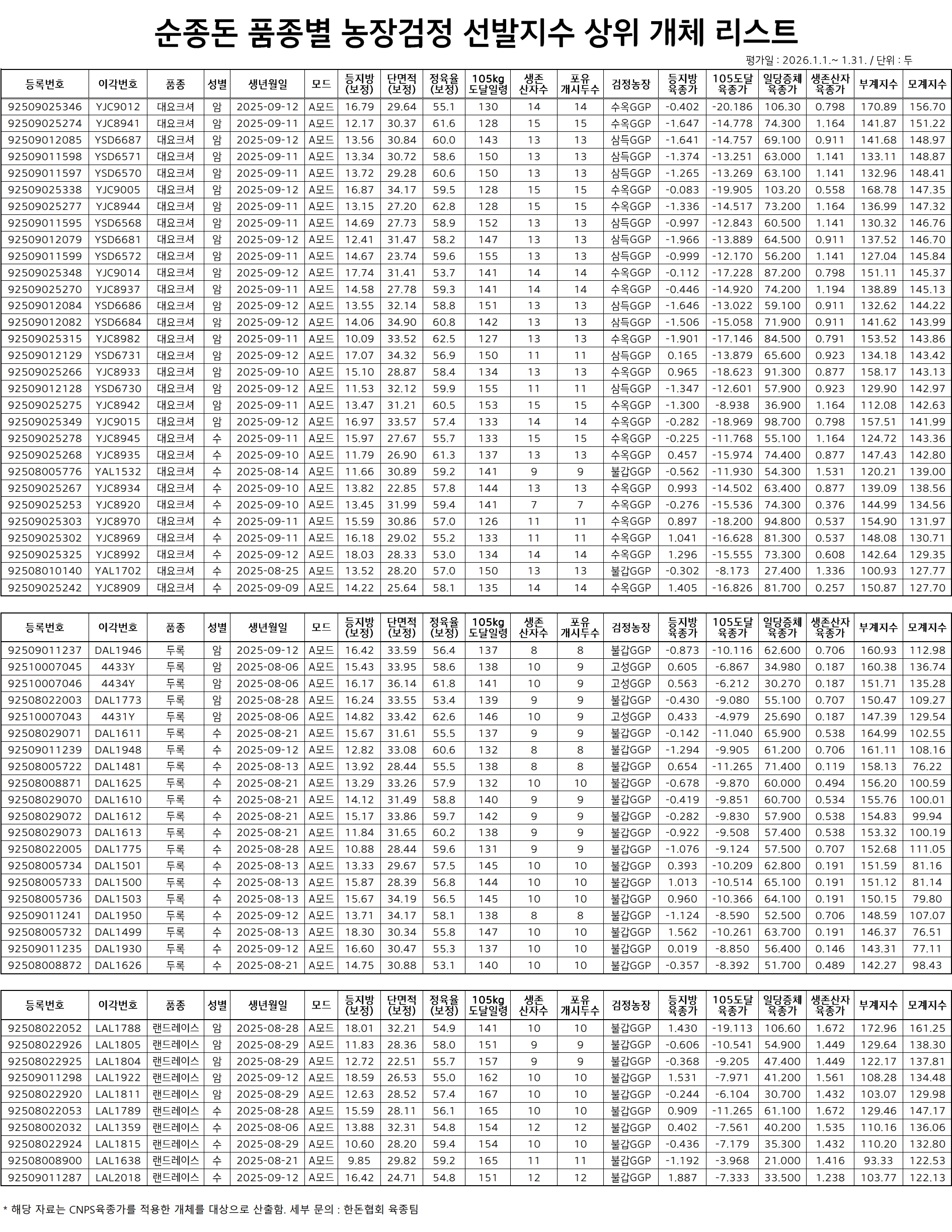 첨부파일 다운로드 26년 1월 순종돈 품종별 농장검정 선발지수 상위 개체 리스트.pdf
