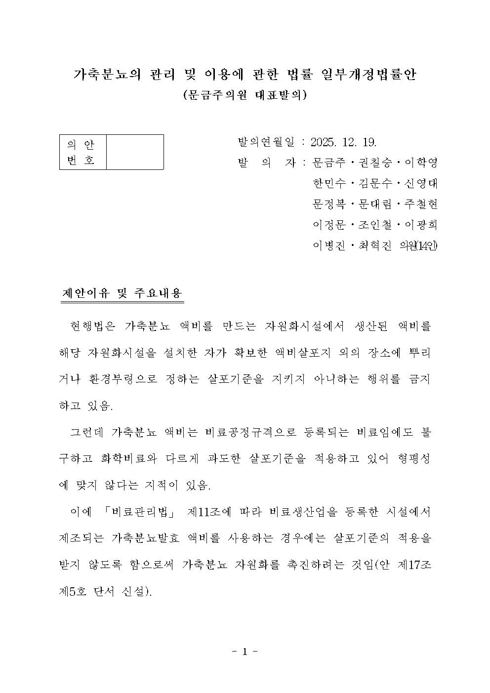 첨부파일 다운로드 [25.12.19] 보도자료_가축분뇨 액비 살포 규제 “근본적 해결 법안” 발의(붙임).hwp
