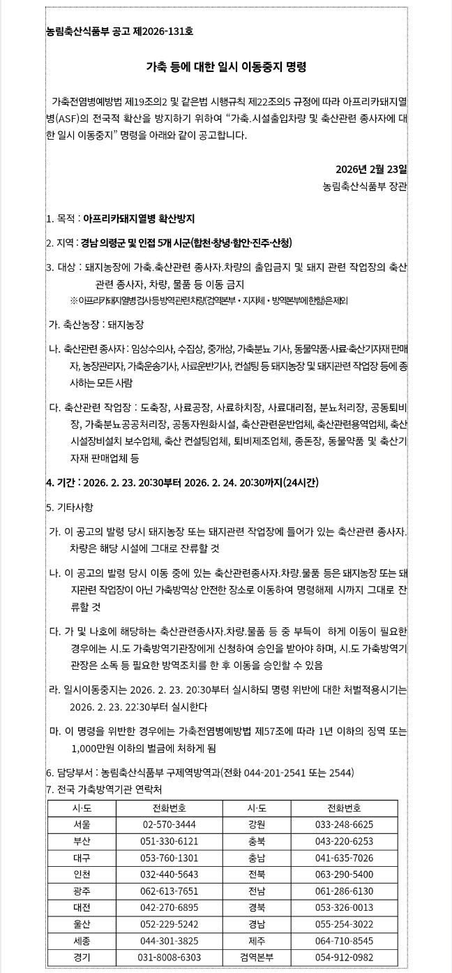 [긴급] 의령 ASF 발생에 따른 일시 이동중지 명령 2.24 20:30까지(24시간)