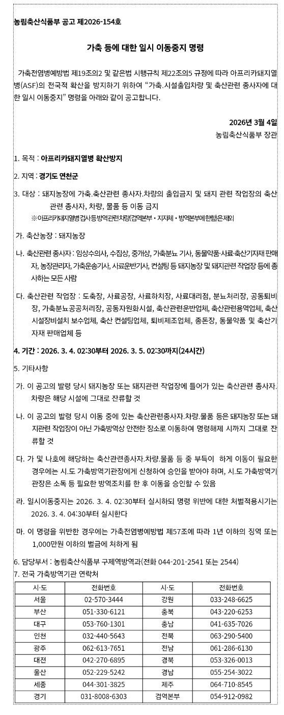 [긴급] 연천 ASF 발생에 따른 일시 이동중지 명령 3.5 02:30까지(24시간)