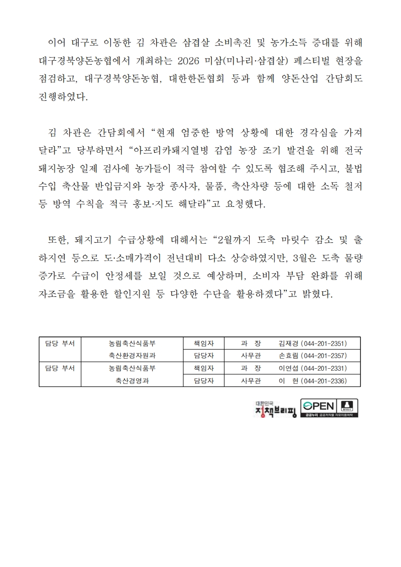 김종구 농림축산식품부 차관은 3월 13일 대한한돈협회 이기홍 회장, 박종우 경북도협의회장, 대구경북양돈농협 이상용 조합장, 최재철 용신영농조합법인 대표, 안병우 농협축산경제 대표 등과 함께 2026 미삼 페스티벌 현장을 점검하고, 대한한돈협회, 대구경북양돈농협 등과 함께 하는 양돈산업 간담회도 함께 했다.