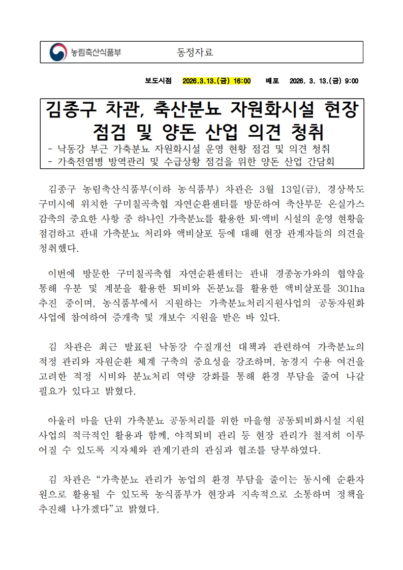 첨부파일 다운로드 (축산정책관-축산환경자원과) 김종구 차관 축산분뇨 자원화시설 현장 점검 및 양돈 산업 의견 청취 동정자료(3.13. 16시).pdf