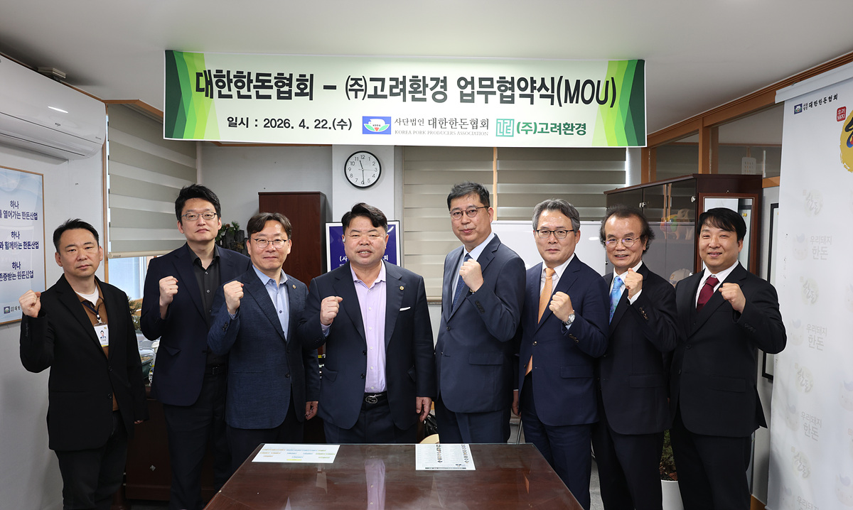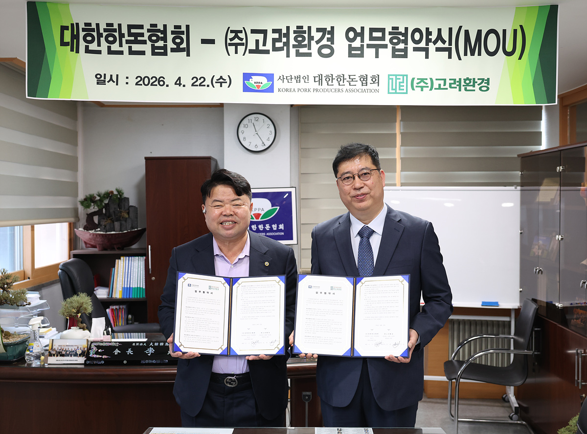 대한한돈협회(이기홍 회장)422일 제2축산회관에서 고려환경(대표 임휘용)과 친환경 축산분뇨 처리 및 냄새저감 기술 개발·보급을 통한 한돈산업 환경경쟁력 강화를 위한 업무협약(MOU)을 체결했다.