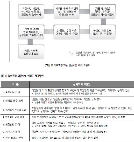 2015년 악취저감 제품 및 시설 검증사업 결과 출처 : 월간한돈 2016. 2월호 1. 사업의 목적 최근 들어 더욱 심각해진 악취문제의 실질적인 해결방안을 제시하기 위해 한돈협회는 업계 최초로 국내에서 시판되고 있는 악취저감 제품 및 시설에 대한 검증사업을 실시하였다. 한돈협회는 검증된 제품을 한돈농가들이 사용함으로써 악취저감 효과를 극대화하고 업체의 과다광고로 인한 피해를 줄이는 한편, 시군 지자체의 미생물제 등 악취저감제 지원사업 선정시 도움을 주고자 이 사업을 추진하였다. 2. 검증 방법 본 사업은 악취 심각농가의 악취수준을 환경부 공인 분석기관 및 장비분석을 통해 측정하고, 저감제품을 3개월간 무상 공급한 다음 다시 한번 동일한 방법으로 악취를 측정하여 저감율을 분석하는 방식으로 진행하였다. 악취 심각농가는 한돈협회 각 지부에서 악취가 가장 심하거나 민원이 많은 농가 3농가 이하를 추천받았으며, 참가업체는 협회 공고를 통해 자신있는 업체가 참여토록 하였다. 5월 사업 추진 당시에는 총 75개 제품이 참여의사를 밝혔으나, 사업포기 등으로 최종 물품을 납품하고 검증을 끝낸 제품은 67개 제품이다. 또한 일부 제품은 2개 농장에서 검증을 실시하여 총 적용 전 88개 농장, 적용 후 77개 농장에 대한 악취측정이 이루어졌다. 협회는 업체를 대상으로 검증사업을 실시하는 만큼, 과학적이고 신뢰할 수 있는 악취측정을 위해 많은 노력을 기울였다. 실제 이번 검증은 약 170여 농가에 대한 악취측정을 통해 국내 양돈장의 악취측정에 대한 신뢰도 있는 기준을 제시하였다는 평가를 받고 있다.
