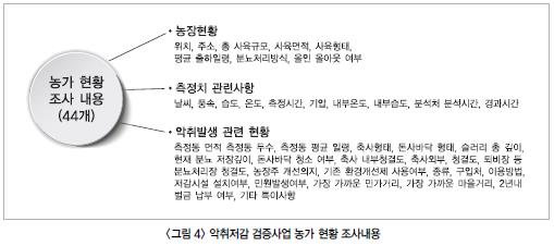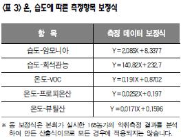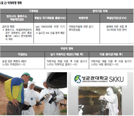 3. 측정방법 악취방지법에 의한 공기희석관능법과 주요 악취물질 22종 중 VFA 4종은 공인 분석기관에 의뢰하였으며, 검지관 및 측정장비로 실시간 측정이 가능한 암모니아, 황화수소, 메틸메르캅탄, VOC는 한돈협회 직원이 함께 방문하여 측정하였다. 4. 농가 현황조사 익취측정은 현실적으로 동일한 시기에 동일한 환경에서 측정할 수가 없고, 농장마다 환경이 다르므로 총 44가지의 농장현황을 조사하여 적용 전/후 측정시 농장상황을 최종 보고서에 함께 공개하였다. 또한 전문 통계분석기관의 통계분석 결과 농장 현황과 측정수치가 유의성 있게 함께 변화하는 5가지 항목(습도‐암모니아, 습도‐희석배수, 온도‐VOC, 온도‐프로피온산, 온도‐뷰틸산)에 대해서 측정데이터를 보정하여 발표하였다.