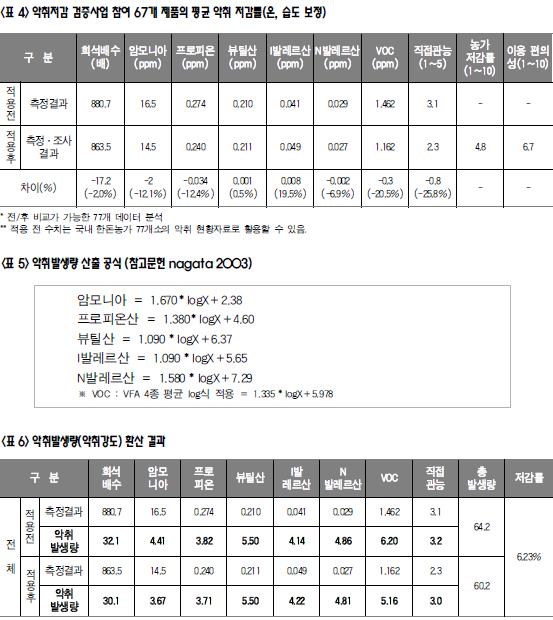 5. 측정결과 악취를 측정해 본 결과, 저감제품 및 시설을 적용하기 전 88개 농장의 악취방지법에 따른 공기희석관능법 희석배수는 880.7배로 나타났고, 암모니아는 16.5ppm, VOC는 1.462ppm 등으로 나타났다. 또한, 적용 2~3개월 후인 적용 후 측정결과는 희석배수 863.5배로 2.0%가 줄어들었고, 암모니아는 14.5ppm으로 12.1%, VOC는 1.162ppm으로 20.5%가 각각 감소한 것으로 나타났다. 측정항목 8개의 평균 저감율은 7.5%로 나타났다. 이러한 수치는 크게 2가지 의미가 있다. 첫째, 업체들의 반발처럼 생각보다 저감율이 낮다는 것이다. 물론 업체들이 과다광고하는 경향이 있다 하더라도 최소 평균 30~50% 수준은 될 것이라는 예상과 달리 평균 저감율은 7.5%에 불과하였다. 오히려 뷰틸산과 I‐발레르산은 다소 증가하기까지 하였다. 이것은 계절적 영향이라고 판단한다. 실제 악취측정의 가장 큰 요인 중 하나가 환기량이다. 아무리 일부 항목을 보정한다 하더라도 6~7월 폭염시와 9~10월 가을철의 환기량 차이로 인해 악취량이 오히려 증가한 제품들이 거의 50%에 달했다. 악취를 감소시키지 못했다기 보다는 계절적으로 악취 측정량이 늘어난 것으로 볼 수 있다. 그러나 모든 제품들에 동일하게 적용되는 문제이므로 검증 결과로는 활용이 가능하다.