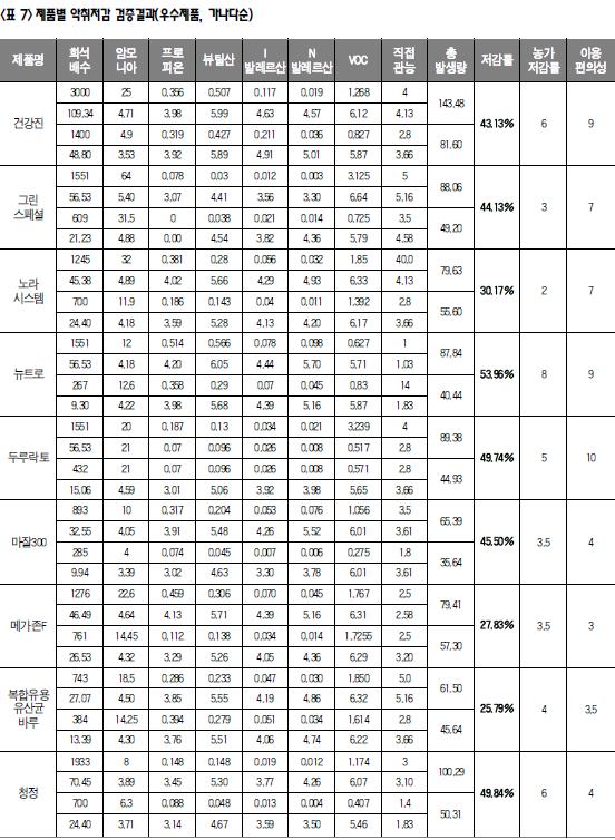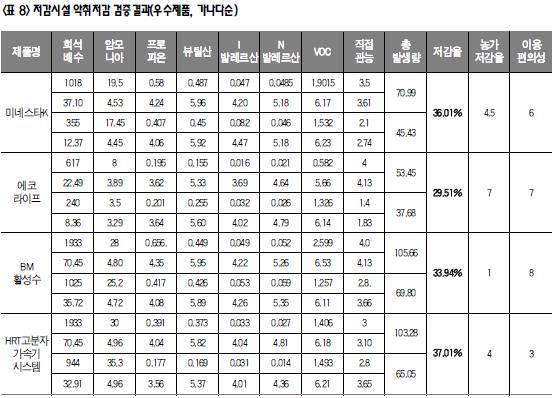 6. 악취발생량(악취강도) 추정치 적용 이번 검증결과는 Weber‐Fechner 법칙을 근거로 8개 측정항목의 총 악취발생량(악취강도)의 개념을 도입하여 농가가 쉽게 악취저감율을 알아 볼수 있도록 하였다. 악취발생량 개념 도입은 사실상 처음 시도된 것으로써 과학적인 근거자료로 활용하기는 어려울 수 있으나 향후 현장에서 축산악취를 평가하는 척도의 하나로써 널리 활용될 수 있을 것으로 기대한다. <표 5 참조> 7. 제품별 검증결과 본 사업의 결과는 업체의 영업손익과 직결될 수 있어 매우 민감함에도 불구하고, 검증사업의 신뢰도를 높이기 위해 제품별 검증결과 수치를 모두 공개하였다. 20% 이상 악취저감 우수 제품으로 선정된 제품들은 총 67개 제품 중에서 미생물 및 환경개선제 12개와 저감시설 4개이다. 다만, 저감시설의 경우에는 부득이 이번 검증에서 농가를 지정하였기 때문에 블라인드 검증이 안되어 다소 신뢰성이 낮다.