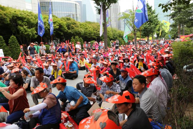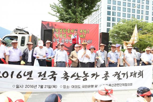 전국의 농축산인 1만2천여명은 지난 7월 21일 여의도 국회의사당 앞에서 농축산인 총궐기대회를 갖고 정부가 ‘김영란법’ 등을 통해 국내 농축산업을 말살하려 하고 있다며 강력히 규탄했다.