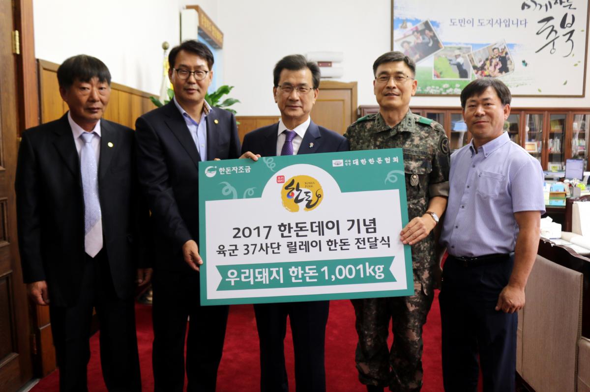 충북도협의회, 한돈데이 맞아 릴레이 한돈 전달식 진행 대한한돈협회 충북도협의회(회장 김정우)한돈데이(10월 01일)를 맞아 대한민국 응원 캠페인의 일환으로 충청북도청을 방문. 육군 37사단에 한돈 1,001kg을 전달하고 군 장병들을 격려했다.