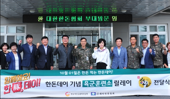 한돈자조금관리위원회(위원장 이병규)는 지난 26일, 오는 10월1일 한돈데이(10월 01일)와 국군의 날을 맞아 대한민국 응원 캠페인의 일환으로 충남 논산에 위치한 육군훈련소를 방문해 1,000만원 상당의 한돈 2,500kg을 전달하고 훈련으로 여념 없는 군 장병들을 격려했다. 이날 행사에는 서상국 육군훈련소장을 비롯해 한돈자조금 배상종 관리위원(대한한돈협회 충남도협의회장), 대한한돈협회 충남도협의회 김경태 부회장, 최상락 감사, 조상덕 사무총장, 도기전 전 논산지부장, 허영란 논산부지부장, 전경애 연무읍장 등 한돈자조금과 부대관계자 20여 명이 참석한 가운데 진행됐다. 이날 전달식에 참석한 한돈자조금 배상종 관리위원은 “지난해에 이어 한돈데이와 국군의 날을 맞아 국가와 국민을 위해 헌신하는 분들을 응원하고 조금이나마 보탬이 되고자 군부대를 비롯한 전국 주요 기관에 한돈을 전달하게 됐다.”며 행사의 취지를 설명했다. 또 이날 행사에 참석한 서상국 육군 훈련소장은 “군 장병들의 사기 진작을 위해 항상 노력해 주셔서 감사하다”며 “성원에 보답할 수 있도록 더욱 강인한 군인정신과 체력을 기를 수 있도록 최선을 다해 노력하겠다”고 전했다. 한편 한돈자조금은 10월1일, 제4회 한돈데이(1001)를 기념해 오는 10월까지 전국 9개 지역의 군 부대, 경찰, 소방 등 주요 기관과 복지시설을 방문해 총 1억 원 상당의 우리돼지 한돈을 전달해 국가와 국민을 위해 헌신, 봉사하는 이들에게 감사의 마음을 전하고 소외된 이웃들과 희망과 행복을 나누는 대한민국 응원 캠페인을 전개한다.