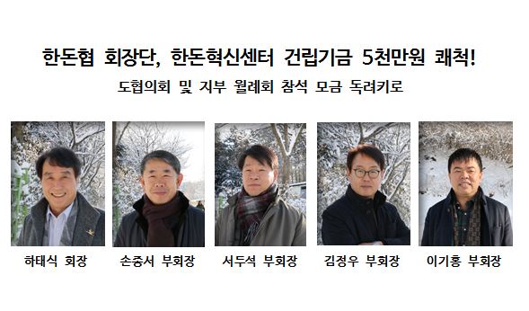 한돈협 회장단, 한돈혁신센터 건립기금 5천만원 쾌척! 하태식 회장 3천만원, 부회장단 2천만원 기탁 모범 경기·강원, 충청, 전라·제주, 경상지역 도협의회 및 지부 월례회 참석 모금 독려키로 오는 2월 한돈협 정기총회에서 혁신센터 건립 추진 의지 재확인할 것