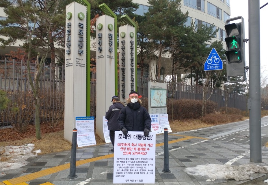 한돈산업 관계자가 1월 18일 세종정부청사 환경부 건물앞에서 무허가축사 적법화 기한 연장을 촉구하는 1인시위를  벌이고있다.