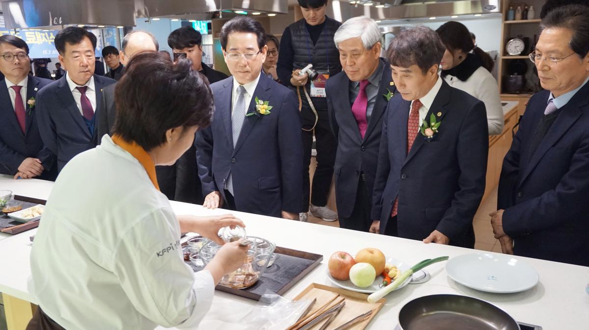 ▲1월 31일 서울 중구 한식문화관에서 평창 동계올림픽 국내산 식재료 공급 협약을 맺은 한돈자조금 하태식 위원장이 올림픽 선수촌 한식메뉴 조리시연을 관람하고 있다. 한돈자조금은 약 2억 원 규모의 1등급 돼지고기 한돈을 선수촌 식단을 위해 지원한다.