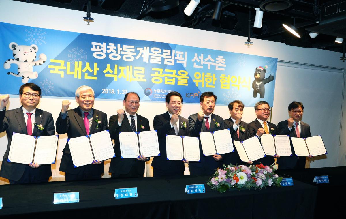 ▲ 지난 1월 31일 서울 중구 한식문화관에서 평창 동계올림픽 국내산 식재료 공급을 위한 협약식을 개최했다. 한돈자조금은 약 2억 원 규모의 1등급 돼지고기 한돈을 선수촌 식단을 위해 지원한다. 사진은 좌측부터 최성재 신세계푸드 대표, 엄경익 횡성축협 조합장, 김태환 농협 축산경제대표, 김영록 농축산부 장관, 민경천 한우자조금관리위원회 위원장, 하태식 한돈자조금관리위원회 위원장, 김영교 평창영월정선축협 조합장, 박홍진 현대그린푸드 대표