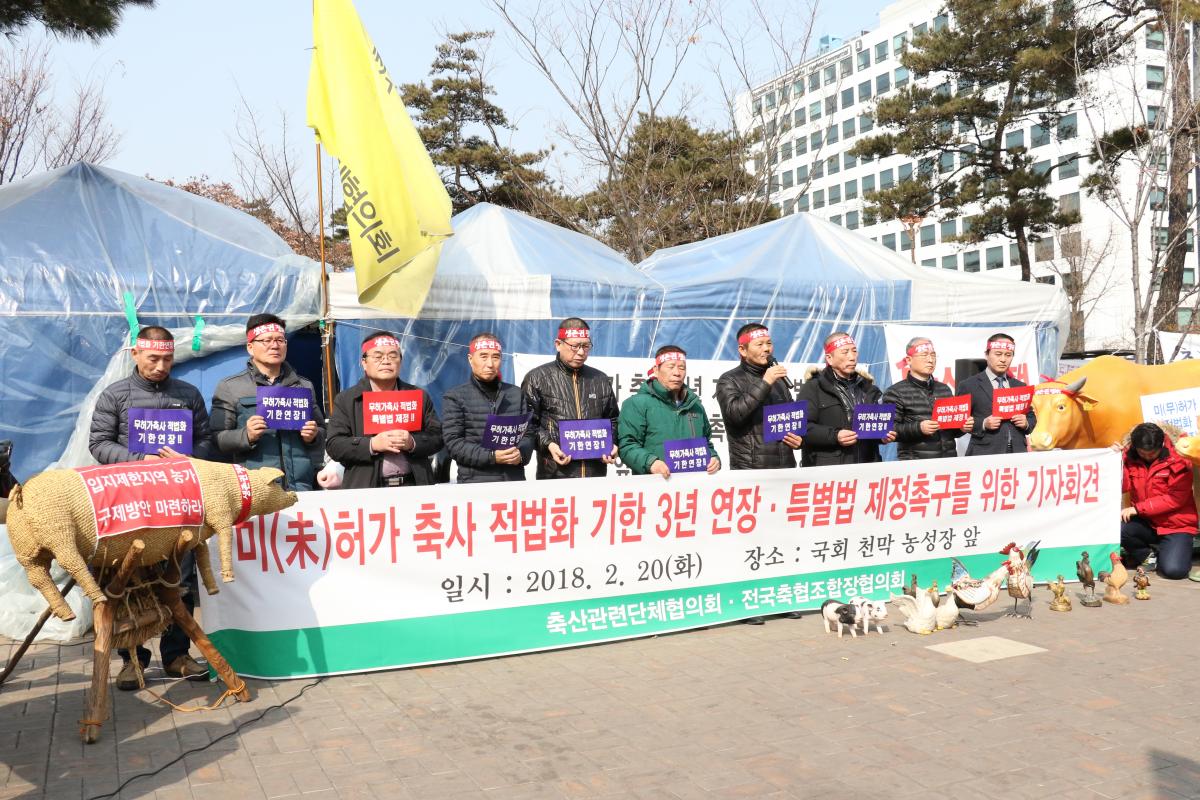 축산업 말살정책 저지, 정부는 축산농가와의 약속을 이행하라! 축산단체, 미허가적법화 기한연장 등 요구사항 미관철 시 가축반납 투쟁 예고 축산단체들이 미허가적법화 3년 기한연장이 안되면 기르던 가축을 모두 청와대에 반납하겠다며 투쟁을 선포했다. 축산관련단체협의회(회장 문정진)·전국축협조합장협의회(회장 정문영)는 2월 20일 여의도 농성장 앞에서 기자회견을 열고, 축산농가와의 약속을 어기며 말살정책을 펼치고 있는 정부를 강하게 규탄했다. 이날 축단협 문정진 회장은 “미(未)허가 축사 적법화 기한연장과 특별법 제정 요구가 짓밟힌다면 전 축산인 가축반납 투쟁은 물론 가축분뇨법 폐지운동 그리고 대정부 강경투쟁 등 목숨을 걸고 싸울 것이다”며 “이와 관련하여 발생하는 모든 문제의 책임은 ‘선대책 후규제’라는 말로 축산 농가를 속이고 모든 책임을 떠넘겨왔던 무능한 정부와 국회에 있음을 분명하게 경고한다“고 결연한 의지를 보였다. 그간 축산단체들은 여의도 국회 앞에서 축산업 말살 정책을 저지하는 선포식을 열고 삭발, 단식투쟁을 이어갔다. 지난 2월 14일에는 단식투쟁 8일 만에 축단협 문정진 회장이 건강악화로 쓰러져 구급차에 실려가기도 했다. 이후 설 명절 연휴 기간에도 축산단체장들은 귀향을 마다하고 텅 빈 여의도 거리의 천막농성장에서 무기한농성을 이어가며 미허가축사 적법화 기한연장을 요구해왔다. 한돈협회 하태식 회장은 “미허가축사 규제는 선량한 축산농가들을 한순간에 범법자로 만드는 법으로 26가지에 이르는 법 규제를 들이밀며 짧은 시간 내 허가를 받기에는 현실적으로 큰 어려움이 따르므로 기한연장 및 신청 절차 간소화로 대한민국의 단백질 공급을 책임지고 있는 축산농가를 구제해야 한다”며 조속한 법 개정을 촉구했다. 하지만 그간 더불어민주당과 환경부 장관은 축산단체의 면담도 거절한 채 정부내부에서만 협의 해왔다. 정부의 자의적 협의 결과 3월 24일까지 적법화 신청서를 제출한 적법화 의지가 있는 농가에 한해서 별도의 이행 기간을 부여하겠다는 입장을 내놓았을 뿐이다. 이에 축산단체들은 “불통의 극치를 보여주는 무능한 정부를 개탄하지 않을 수 없다”며 “목숨을 걸어서라도 투쟁하겠다”며 강경한 입장을 전달했다.