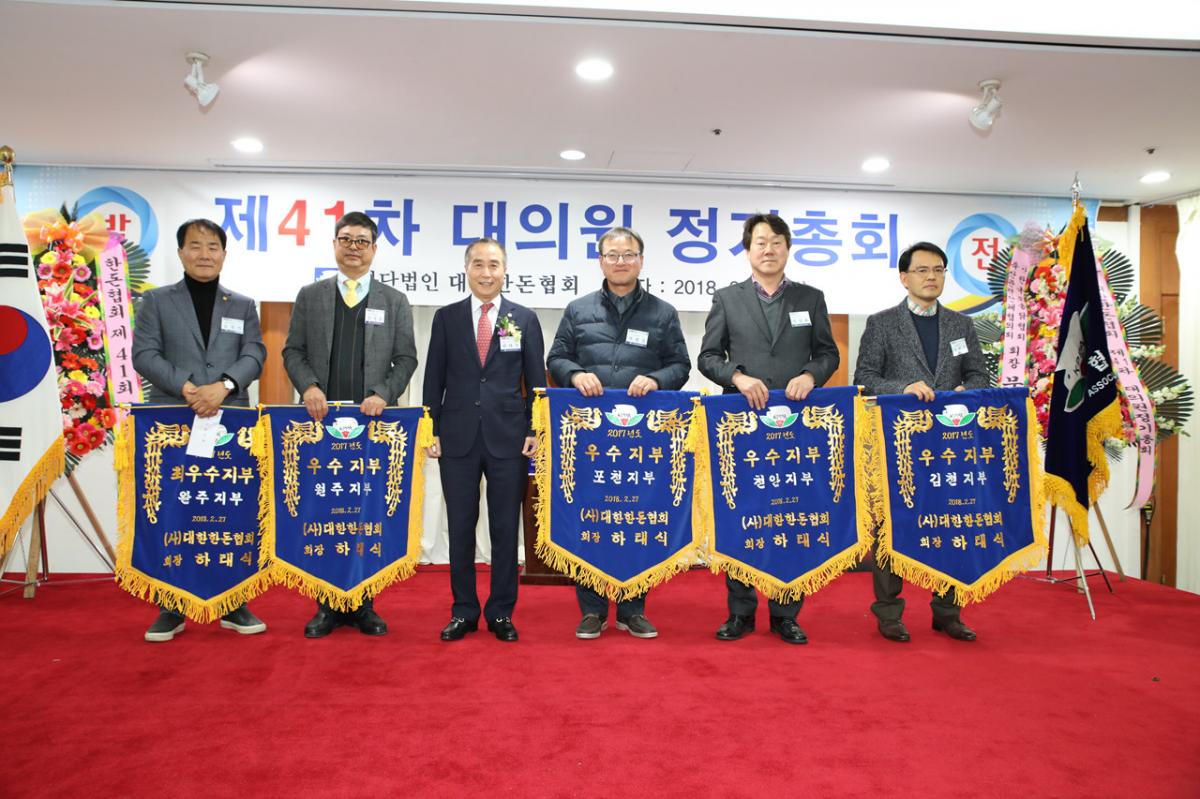 대한한돈협회(회장 하태식)는 2월 27일(화) 대전 계룡스파텔에서 제41차 대의원 정기총회를 개최했다. 이번 41차 대의원 정기총회에는 2017년 회계결산 감사 보고 등 협회 주요활동사항을 보고하고, 제2검정소 자산 폐기(안), 2017년 수지 결산 승인(안), 2018년 회비 부과 기준 승인(안), 2018년 사업계획 승인(안), 2018년 수지 예산 승인(안), 본회 정관 개정(안), 한돈혁신센터 모금 결의(안)을 심의했다. 또한 한돈산업과 협회 발전에 기여하신분에 대해 농축산부장관상 표창, 협회장 표창, 최우수·우수지부 시상, 우수직원 표창 등이 이어졌다.