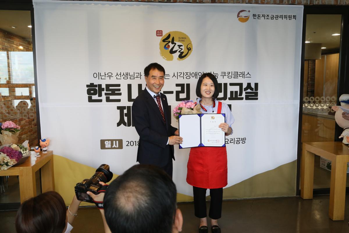 한돈, 시각장애인과 함께하는'한돈 나누-리 요리교실' 성료 ∎한돈자조금, ‘한돈 나누-리 요리교실 제 8기’ 개최 ∎’한돈 요리교실로 자신감 뿜뿜‘... 한돈자조금, 시각장애인 나눔 쿠킹클래스 유종의 미 얻어 한돈농가 비영리단체 한돈자조금관리위원회(이하 한돈자조금, 위원장 하태식)는 29일, 서울 서대문에 위치한 청정원 요리공방에서 지난 1개월여 간 진행된 ‘2018 한돈 나누-리 요리교실’을 성황리에 마무리했다. 올해 8기를 맞이한 ‘한돈 나누-리 요리교실’은 지난 2014년부터 한돈 명예홍보대사 나우쿠킹 이난우 대표와 함께하는 사회공헌 프로그램이다. 평소 칼과 불을 이용해 요리를 하기 어려운 시각장애인들에게 요리의 기회를 제공하며, 시각장애인들로 하여금 자신감과 성취감을 느끼게 하고, 나아가 행복하고 활기찬 생활을 할 수 있도록 마련된 특별한 요리교실이다. 지난달 17일부터 총 6회에 걸쳐 진행된 이번 프로그램은 ▲한돈 된장구이, ▲한돈 떡갈비, ▲한돈 제육덮밥 등 각 회차별로 실생활에서 쉽게 활용할 수 있는 메뉴들로 구성했다. 또한, 요리교실에서 배운 요리법을 직접 가정에서 실습해 볼 수 있도록 시각장애인을 위해 특별히 제작된 점자 요리책을 제공해 참가자들로부터 좋은 반응을 얻었다.