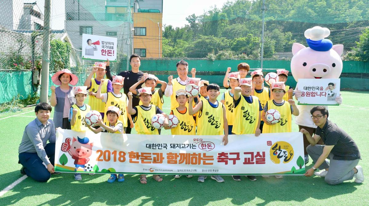 ▲ 6/21(목)‘2018 한돈과 함께하는 축구교실’에서 한돈자조금 하태식 위원장과 옹달샘지역센터 관할 미래의 꿈나무들이 국가대표 선수를 응원하고 있다.