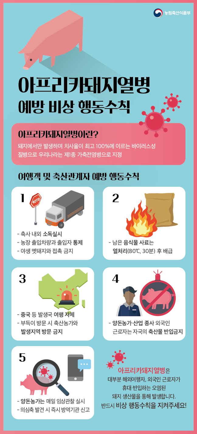| 첨부파일 | 다운로드 아프리카돼지열병+예방+비상+행동수칙.pdf | ||