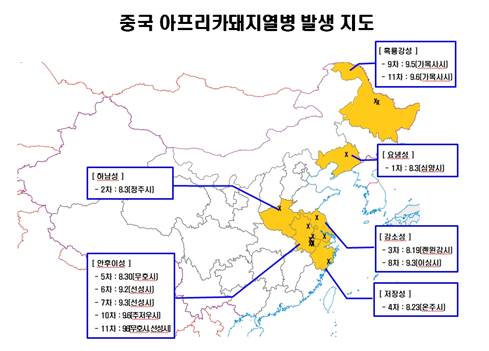 중국 농업농촌부는 흑룡강성 자무쓰시, 안후이성 무호시·선성시의 농가에서 ASF가 확진되었다고 지난 9.6일 발표했습니다. 확진 후 중국당국은 긴급 봉쇄 및 통제 조치를 하였습니다.