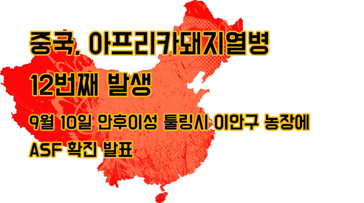 중국 농업농촌부는 10일 저녁 9시 15분경 홈페이지를 통해 12번째 ASF 확진 사례를 공개했습니다. 안후이성 툴링시 이안구 소재의 양돈장(219두 규모)에서 63두가 이상 증세를 보인 가운데 23두가 폐사해 검사한 결과 최종 ASF로 확진되었다는 것입니다.