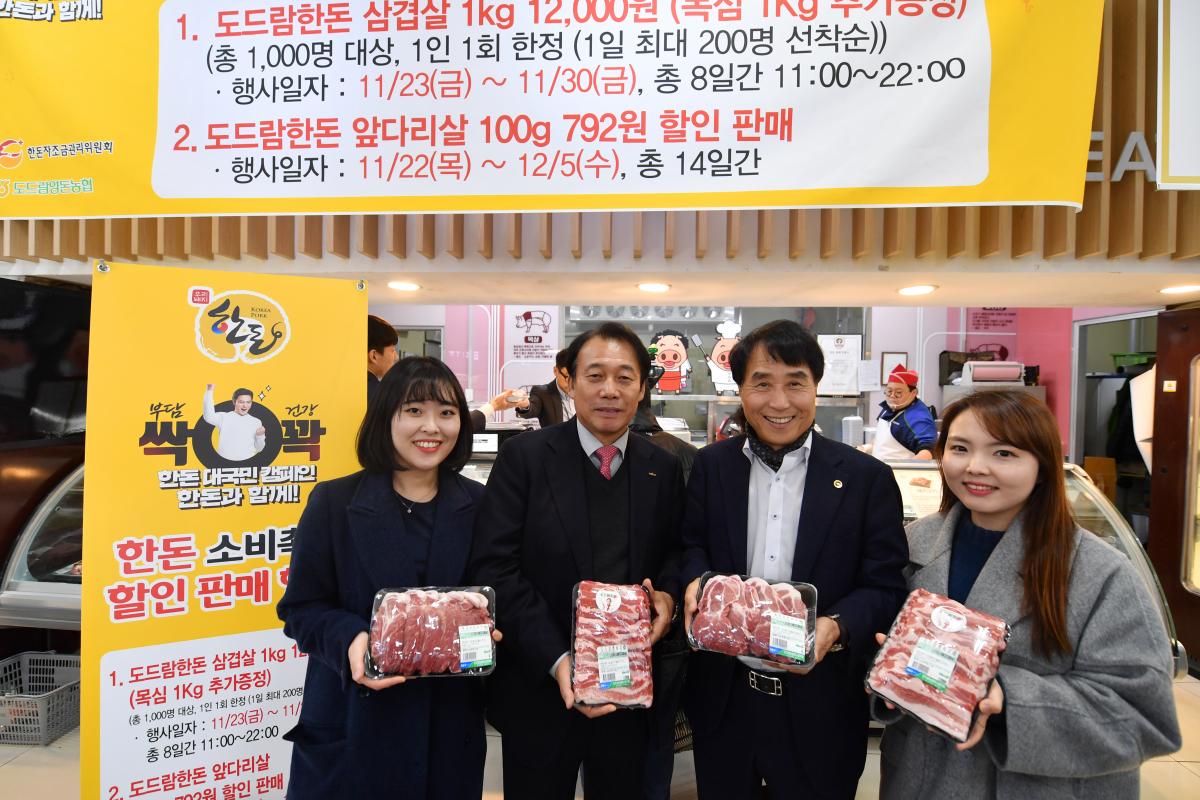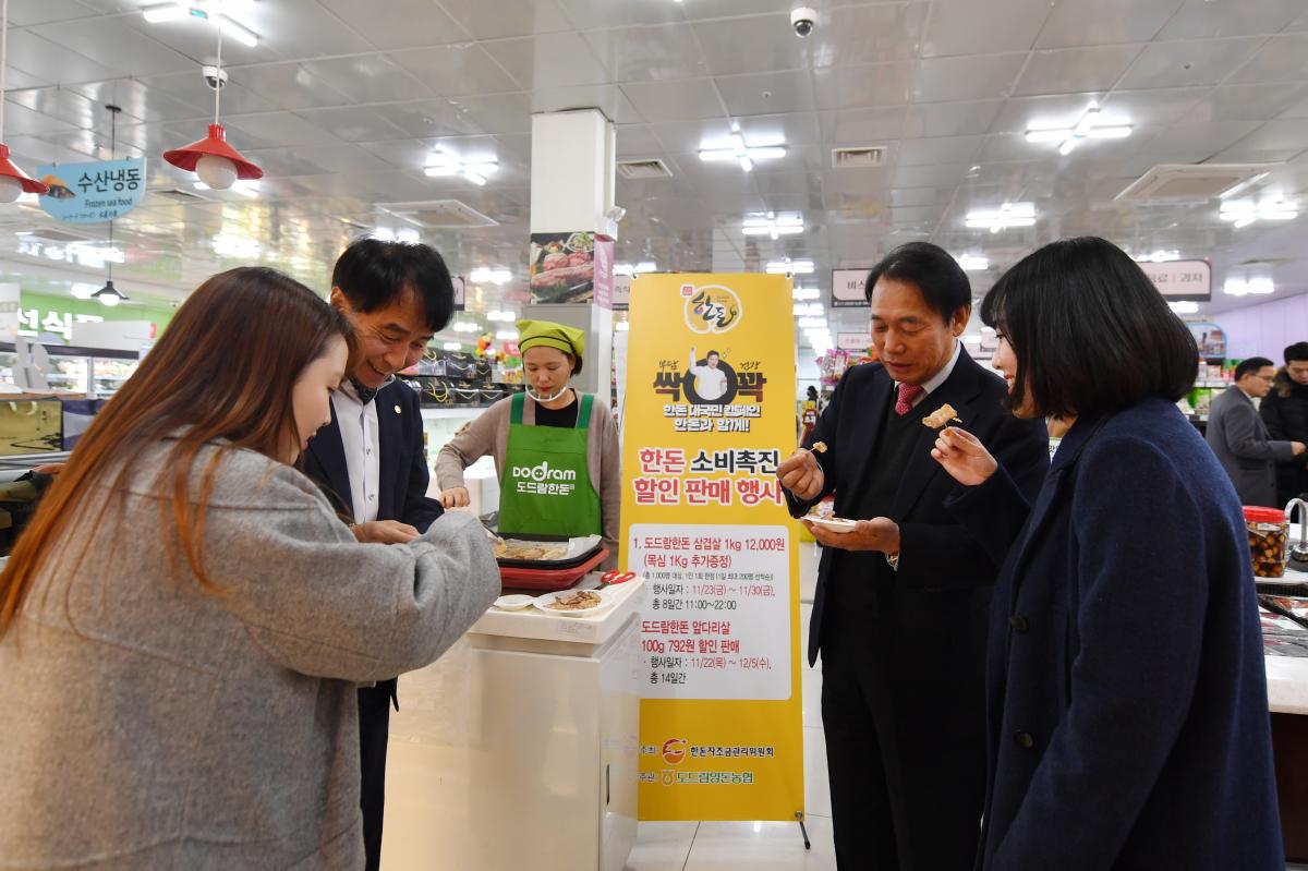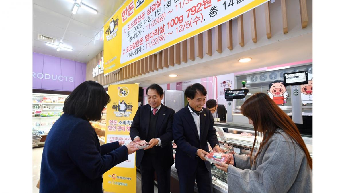 한돈자조금은 22일(목)부터 12월 2일(일)까지 기간 중 전국 7개 양돈조합 및 한돈 BI(Brand Identity)계약 1차 육가공업체 직영판매장에서 할인 및 증정행사를 진행한다. 23일(금) 행사를 기념하기 위해 경기 이천 도드람양돈농협 하나로마트를 방문한 한돈자조금 하태식위원장(왼쪽에서 3번째)이 행사장을 참관하고 있다.