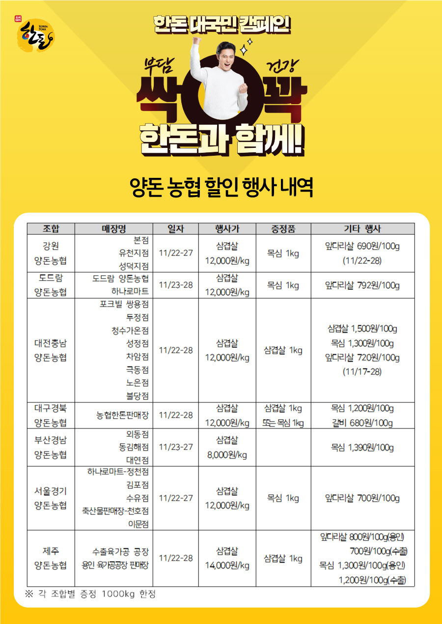 한돈자조금은 22일(목)부터 12월 2일(일)까지 기간 중 전국 7개 양돈조합 및 한돈 BI(Brand Identity)계약 1차 육가공업체 직영판매장에서 할인 및 증정행사를 진행한다. 사진은 양돈농협 할인행사내역. |