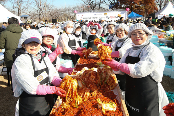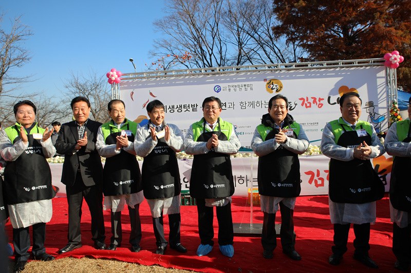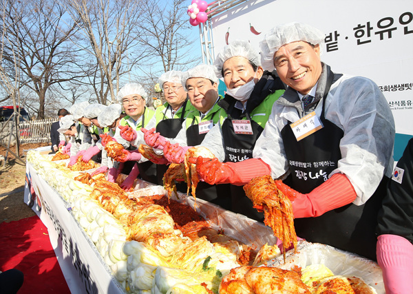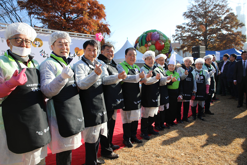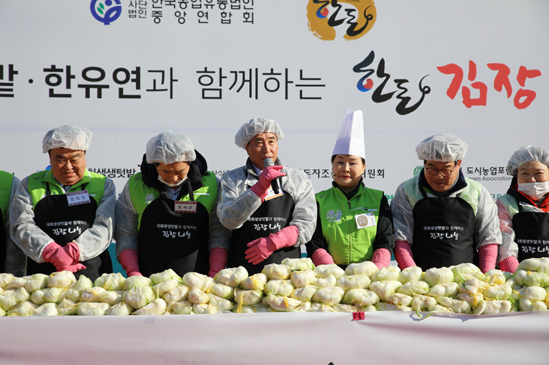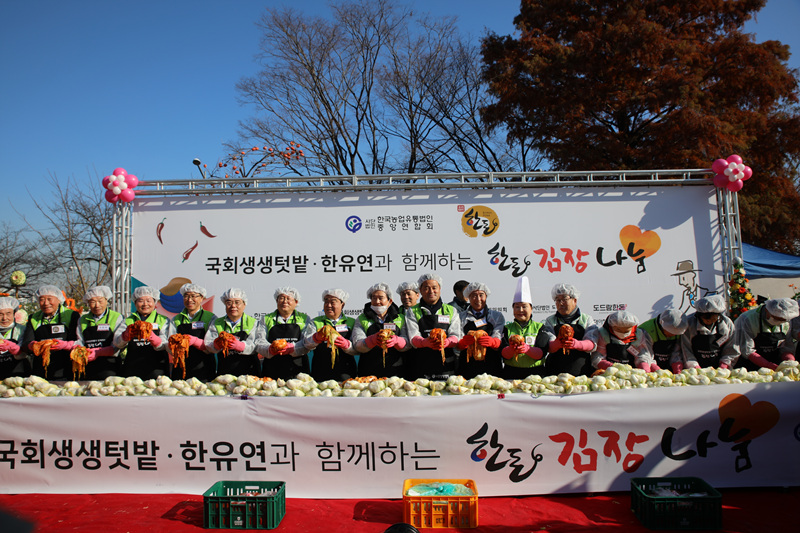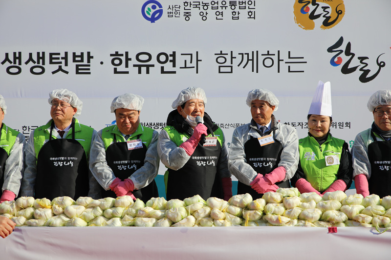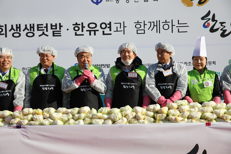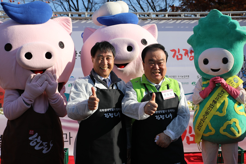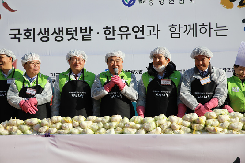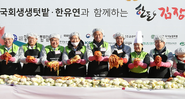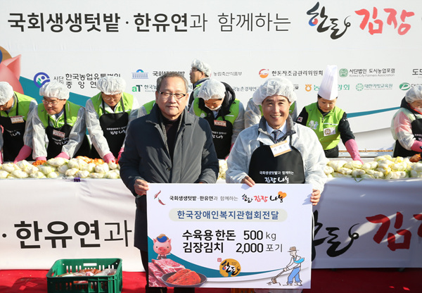 한돈자조금은 지난 11월 30일(금) 여의도 국회의사당 옆 생생텃밭에서 ‘국회 텃밭 · 한유연과 함께하는 한돈 김장 행사’를 개최했다. 국회 생생텃밭이 주최하고 한돈자조금관리위원회, (사)도시농업포럼, (사)한국농업유통법인중앙연합회(이하 한유연), 농림축산식품부가 공동 주관한 이날 행사에는 문희상 국회의장, 정세균 국회의원, 설훈 의원, 임종성 의원, 손혜원 의원, 유인태 국회사무총장, 신동헌 경기도 광주시장, 백현길 한국농업유통법인중앙연합회 회장, 김병원 농협중앙회 회장, 장순욱 한국장애인복지관협회 회장, 자원봉사자 등 총 200여 명이 참석한 가운데 진행됐다. 한돈자조금은 사회공헌활동의 일환으로 지난 2015년부터 매년 김장과 한돈 수육을 이웃과 나누고 있다. 올해는 김장을 직접 담그기 어려운 장애인 가구에 전달하기 위해 김장김치 2,000포기와 우리돼지 한돈 수육 500kg을 준비했다. 이날 담근 김장과 수육은 총 500개의 나눔박스에 포장되어 현장에서 한국장애인복지관협회에 전달됐다. 문희상 국회의장은 "가장 아름다운 가을·초겨울 청명한 날씨에 국회 텃밭 김장을 어려운 이웃에 전하는 가장 아름다운 나눔을 하게 된 것은 우연이 아니다"고 말했다. 또 "이번에 한돈협회가 돼지고기 나눔도 함께하는데, 저 '문돈'은 동족의 슬픔을 같이하기 위해 한돈협회 찬조출연을 한 것"이라고 농담하며 참여자들로부터 웃음을 자아냈다. 정세균 의원은 "19대 국회 때 처음 텃밭을 만들어 처음에는 감자를 수확했다가 3년 전부터 배추를 심고, 김장을 하기 시작했다"며 "농협과 한돈협회와 도시농업포럼 등과 함께 김장을 하고, 어려운 이웃과 함께 김장을 나눌 수 있어서 매우 뜻깊다"고 말했다. 한돈자조금관리위원회 하태식 위원장은 “즐거운 분위기 속에서 담근 김장김치를 우리돼지 한돈과 함께 장애인 가구에 전달해 매우 기쁘고, 앞으로도 많은 이웃과 함께할 수 있는 사회공헌활동을 지속적으로 전개해 나갈 계획”이라고 말하는 한편 “오늘 이렇게 한돈 수육을 전달할 수 있도록 도움을 준 도드람양돈농협 조합장님을 비롯한 조합원들에게 감사의 말씀을 전한다”고 말했다.
