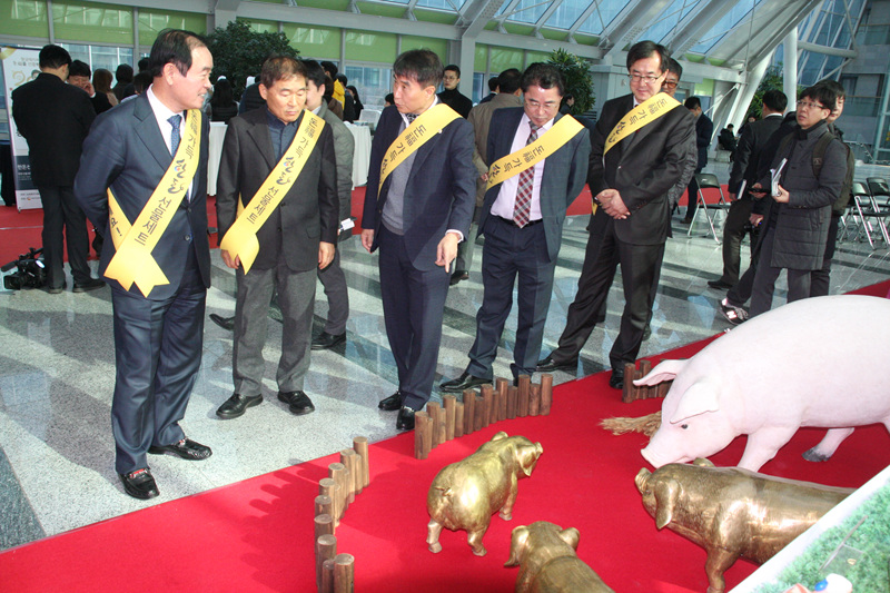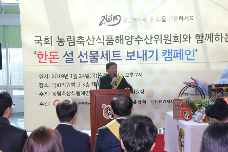 한돈자조금관리위원회(위원장 하태식)는 국회 농림축산식품해양수산위원회(위원장 황주홍), 대한한돈협회, 농협경제지주 축산경제와 함께 1월 24일 국회의원회관 3층 로비에서 ‘한돈 설 선물세트 보내기 캠페인’을 열고 전국민적인 도움을 호소했다. 이번 행사는 설 명절을 앞두고 큰 폭으로 떨어지고 있는 돼지가격으로 심각한 피해를 입고 있는 5,000여 국내 한돈 농가를 응원하기 위해 자조금이 국회 농해수위와 특별히 마련한 대국민 캠페인이다. 이번 행사에는 국회 황주홍 농해수위원장, 민주평화당 장병완 의원, 민주평화당 최경환 의원, 더불어민주당 윤준호 의원, 대한한돈협회 하태식 회장, 장성훈, 왕영일 감사, 농협경제지주 안병우 축산기획본부장, 등이 참석해 한돈 설 선물세트 보내기 퍼포먼스를 선보이고 한돈 통돼지 바비큐 시식에 참여하는 등 대대적인 농가 살리기에 나섰다. 이 외에 현장에서는 황금돼지 조형물 전시회, 한돈 농가 응원 메시지 남기기, 한돈 설 선물세트 주문 접수 등 다양한 부대행사가 열렸다. 특히 기해년 황금돼지해를 맞아 행사장을 찾은 국회 직원 및 일반인 방문객들에게 황금돼지 저금통과 탁상용 달력을 무료 제공해 큰 호응을 얻었다. 황주홍 농해수위원장은 “한돈 농가들이 그 어느 때보다 어려운 상황에 직면한 만큼 이번 설 명절에는 많은 국민들이 이웃, 친지와 한돈 선물을 나누면서 함께 농가 응원에 동참했으면 한다”고 말했다. 하태식 한돈협회장은 “농해수위에서 발 벗고 나서서 적극적으로 한돈 설 선물세트 보내기 캠페인에 참여해주셔서 농가로서는 큰 힘이 된다”며 “한돈 설 선물세트는 합리적 가격과 실속을 갖춘 알찬 구성으로 선물하는 분과 받는 분 모두에게 큰 만족감을 주는 만큼 국민들의 많은 사랑을 부탁한다”고 말했다.
