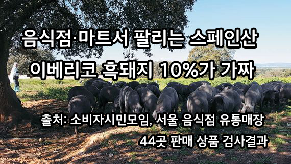 소비자시민모임은 지난 18일부터 22일까지 닷새간 서울 음식점과 유통매장 44곳에서 판매되는 스페인산 이베리코 흑돼지를 대상으로 판별검사를 한 결과 50개 중 5(10%)가 이베리코 돼지가 아닌 백색 돼지인 것으로 나타났다고 25일 밝혔다.