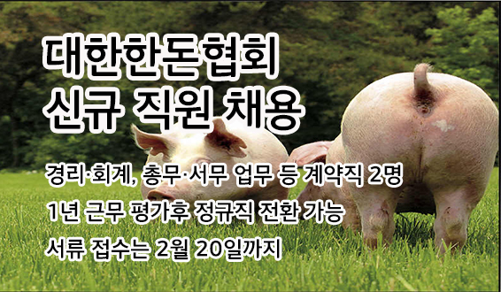 [구인] 대한한돈협회 신규 직원 채용 경리·회계, 총무·서무 업무 등 계약직 2명..1년 근무 평가후 정규직 전환 가능 서류 접수는 2월 20일까지 사단법인 '대한한돈협회'에서 국내 한돈산업의 발전을 위해 함께 일할 우수한 인재를 아래와 같이 모집합니다. 1. 채용인원 : 계약직 2명 ○계약 기간 : 1년 (근무 평가 결과에 따라 정규직 전환 가능)