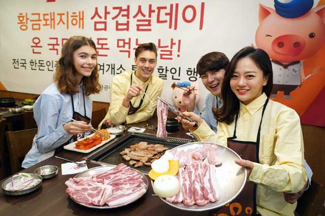 ▲ 황금돼지해 삼겹살데이, 전 세계인 한돈 먹는 날! 최근 한 조사에 따르면 한돈 삼겹살은 외국인 관광객들이 선정한 ‘다시 먹고 싶은 한국음식’ 1위로 꼽히며 한국 대표 음식임을 입증했다.