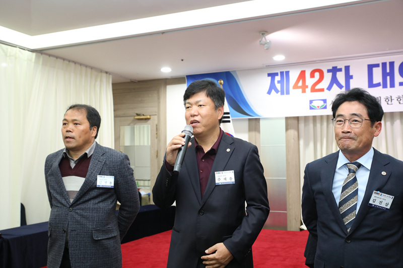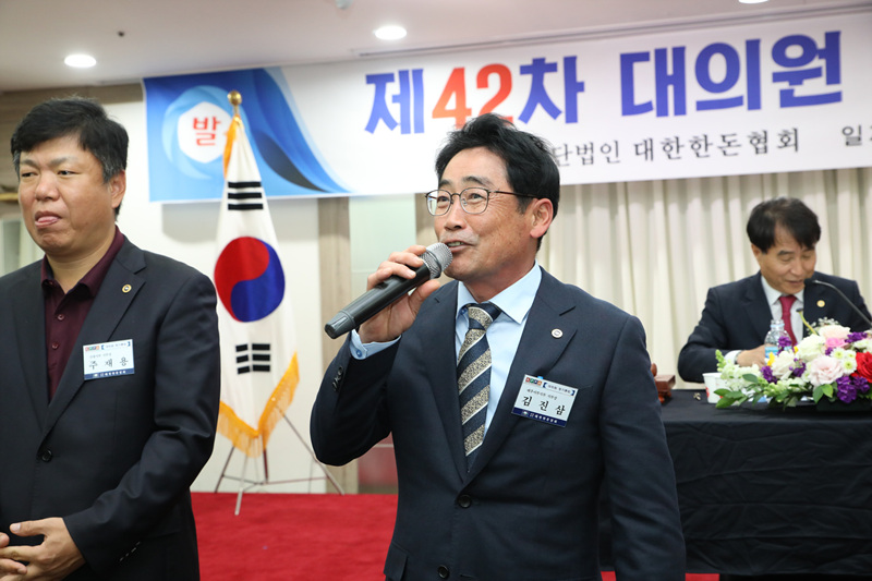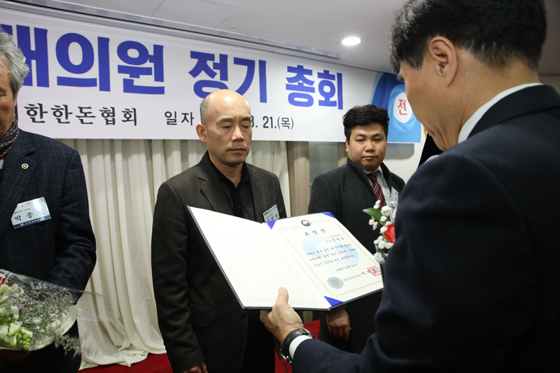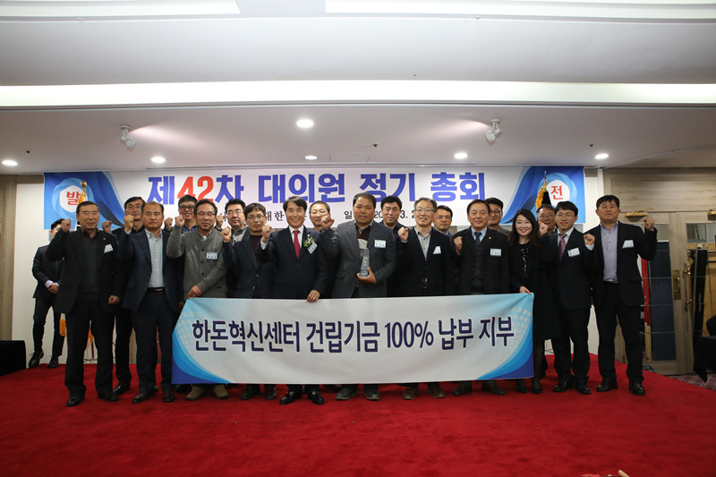 ○ 최근 돈가 하락에 따른 한돈농가의 생존을 위한 방안으로 ‘모돈감축’이 논의되었으나 대의원들은 수입육업계 수입량 축소, 대기업 모돈 감축, 대규모 농가 우선감축(10,000두 이상) 선행되었을 때만 한돈농가의 모돈감축을 시행키로 결의했다. ○ 대한한돈협회(회장 하태식)은 3월 21일(목) 대전 유성소재 계룡스파텔에서 제42차 대의원 정기총회를 개최했다. 하태식 한돈협회장은 인사말을 통해 “지난해부터 지속되고 있는 돼지가격 폭락과 올해 초 갑작스런 구제역 발생으로 농가 경영에 한돈농가의 심려가 많았다며, 협회는 한돈농가를 위협하는 어떤 요소도 간과하지 않고 기본에 충실히 ‘국민과 함께 성장하는 한돈산업’을 만들어 갈 것을 약속한다며, 어려움이 커질수록 슬기와 지혜를 모아 한돈인들이 한돈협회를 중심으로 단합해 희망적인 한돈산업의 미래를 만들어 나가자”고 강조했다. ○ 이날 대의원들은 제42차 한돈협회 대의원 정기총회에서 제7호 의안으로 모돈감축 계획(안)을 심도있게 논의했다. ○ 이날 대의원들은 모돈 감축의 필요성을 공감하면서도 한돈농가만 모돈감축할 경우 돈가가 오르면서 수입 돈육도 같이 증가할 수 있고, 모돈 감축을 통해 기업들이 모돈을 되레 늘릴 우려가 있어 신중해야 한다는 의견이 대두되어 돈가안정과 수급조절의 실효성을 위해서는 국내 수입육업계의 수입량 축소와 대기업 모돈 감축이 선행되어야만 한다고 의견이 모아졌다. ○ 이에 이날 대의원들은 수입육업계 수입량 축소, 대기업 모돈 감축 , 대규모 농가 우선감축(10,000두 이상)이 선행되었을 때만 한돈농가의 모돈감축을 시행키로 결의했다. 또한 농가의 모돈 감축 진행시 일괄 10% 모돈감축 보다는 규모별 차등적용을 검토하여 진행키로 했으며, 자세한 내용은 차기 이사회를 통해 세부사항을 결정키로 했다. ○ 이와 관련해 하태식 한돈협회장은 “최근 돈가 하락에 따른 한돈농가의 생존을 위한 방안으로 모돈감축 추진방안에 대한 회원들의 고견을 듣고 조건부로 추진키로 했다. 차기 이사회를 통해 구체적인 방법을 마련하여 국민의 공감대를 형성하고, 수급 조절을 통한 돈가 안정화에 도움이 되는 방향을 추진하겠다라고 밝혔다. ○ 한편 이번 42차 대의원 정기총회에는 하태식 회장을 비롯해 본회 부회장과 각 도협의회장, 지부장 등 대의원이 참석하였으며, 2018년 수지결산 승인 및 2019년 사업계획 승인 등 안건심의와 협회 활동보고, 2018년 회계연도 감사보고, 대통령 표창, 농림축산식품부장관상 표창, 협회장 표창, 최우수·우수지부 시상, 우수직원 표창 등을 진행했다.
