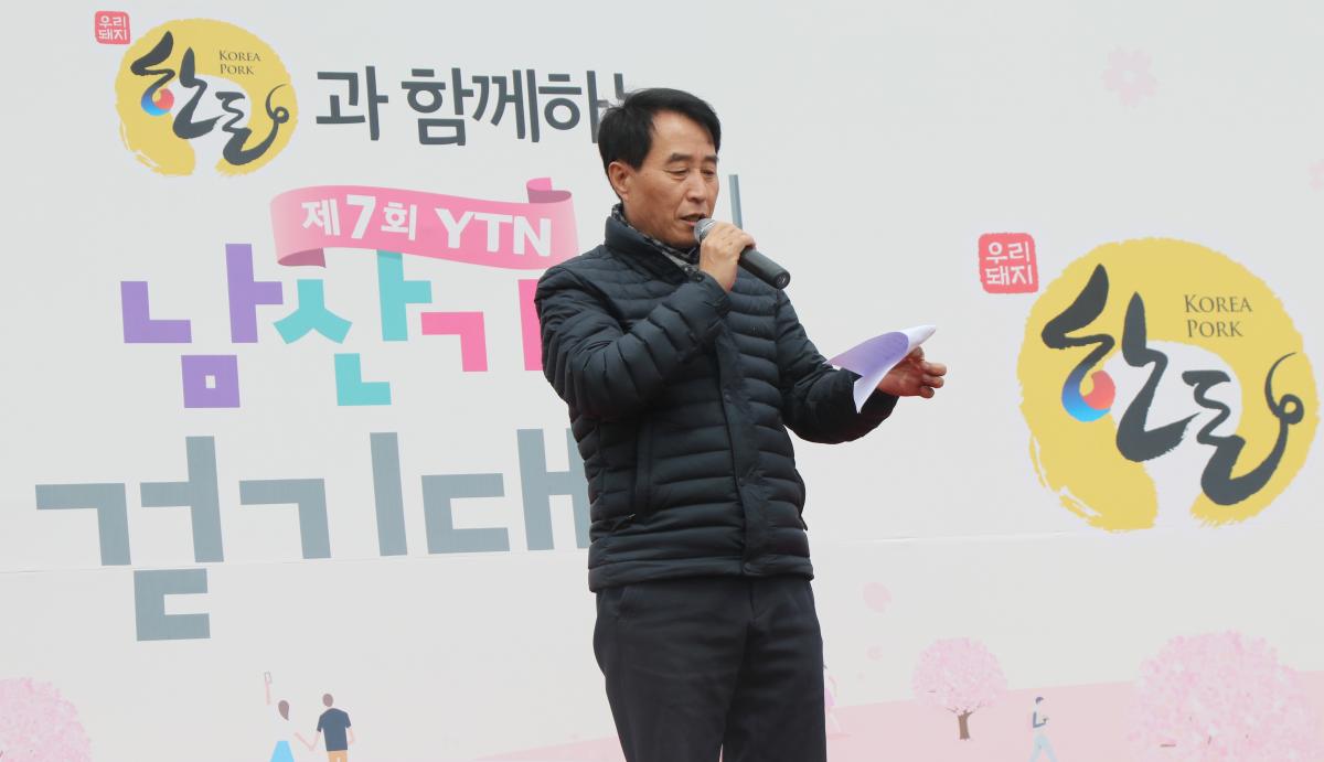 ▲ 개회사 낭독중인 하태식 위원장 ‘2019 한돈과 함께하는 남산걷기대회’에서 한돈자조금 하태식 위원장이 개회사를 낭독하고 있다.