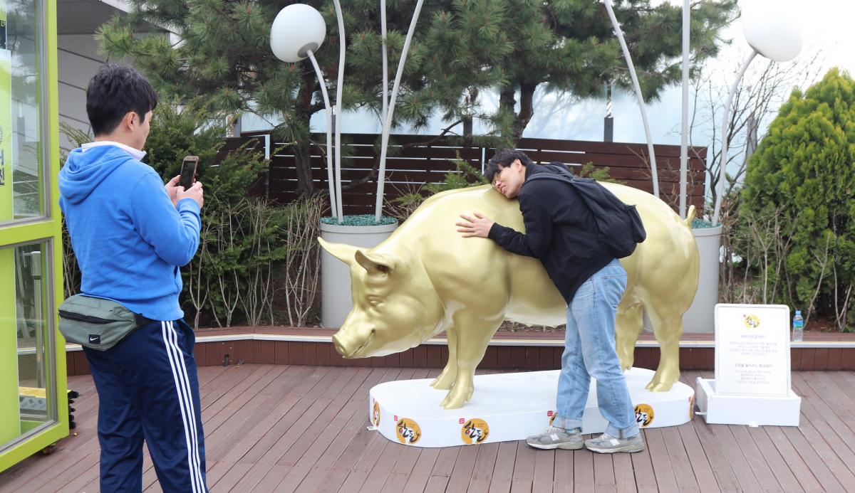 ▲ 만지면 복을 주는 황금돼지 ‘2019 한돈과 함께하는 남산걷기대회’에서 참가자가 황금돼지 조형물 앞에서 기념촬영을 하고 있다. 한돈 황금돼지 조형물은 연말까지 남산타워에 상설 전시될 예정이다. |