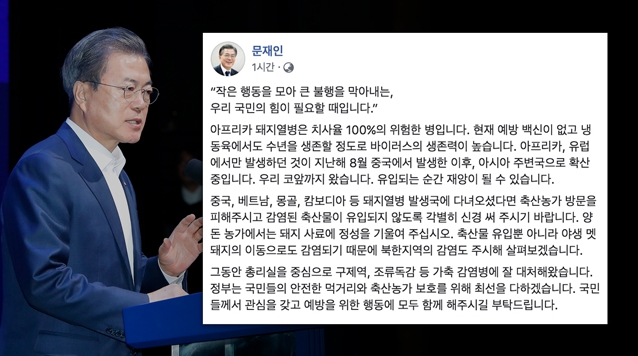 문 대통령은 이날 소셜네트워크서비스(SNS)에 올린 글을 통해 "아프리카 돼지열병은 치사율 100%의 위험한 병이다. 유입되는 순간 재앙이 될 수 있다"며 이같이 밝혔다.