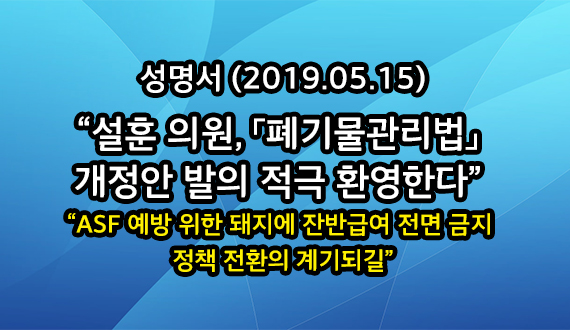 [한돈협회 성명서] “설훈 의원, 「폐기물관리법」 개정안 발의 적극 환영한다” “ASF 예방 위한 돼지에 잔반급여 전면 금지 정책 전환의 계기되길” 1. 더불어민주당 설훈(부천 원미을) 의원이 최근 전세계에 유행하고 있는 아프리카 돼지열병의 국내 유입을 예방하기 위해 돼지에게 잔반급여를 전면 금지하는 내용의 「폐기물관리법」개정안을 14일 대표 발의했다. 2. 설훈 의원이 발의한 폐기물관리법 제15조2 5항에 따르면 “제1항에 따른 음식물류 폐기물 배출자, 제25조에 따른 폐기물처리업자 및 제46조에 따른 폐기물처리 신고자는 음식물류 폐기물을 「축산법」 제2조제1호의 가축 중 돼지의 먹이로 사용하거나 돼지 사료의 원료로 사용하는 행위를 하여서는 아니된다” 라는 조항이 신설됨으로써 돼지에게 잔반급여가 원천적으로 금지되는 내용을 담고 있다. 3. 대한한돈협회(회장 하태식)는 ‘ASF의 국내 유입의 위험성이 더욱 높아지는 시점에 국내 축산업 보호를 위해 잔반급여 금지를 위한 제도적 장치 마련에 노력하고 있는 설훈 의원의 헌신적인 노력에 깊은 감사와 환영의 뜻을 표한다. 4. 설훈 의원의 이번 개정안 발의를 통해 한돈농가와 전문가가 이구동성으로 필요성을 제기하는 돼지에게 잔반급여 전면 금지가 조속히 법제화되는 계기가 되길 한돈농가들은 간절히 기대한다. 대한민국 축산업 보호를 위한 국회 설훈 의원의 깊은 이해와 성찰에 다시 한번 감사와 환영의 뜻을 전하며, 이번 법안이 조속히 통과되어 혹시 모를 국경검역의 허점을 방비할 대책으로 연결되길 다시 한번 간절히 기대하는 바이다. 2019년 05월 15일 사단법인 대 한 한 돈 협 회 장 서울서초구 서초중앙로6길 9 T. 02)581-9751 F. 02)581-9768