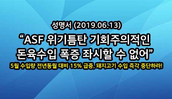 ASF 위기틈탄 기회주의적인 돈육수입 폭증 좌시할 수 없어 5월 수입량 전월 대비 15% 급증, 돼지고기 수입 즉각 중단하라! 1. 지난해부터 시작된 소비침체로 돼지가격이 성수기에도 약세를 면치 못하고 있는 가운데 5월 돼지고기 수입량이 전월대비 15% 늘면서 올 최고치를 기록했다고 한다. 대한한돈협회(회장 하태식)는 ASF 위기상황으로 농가는 생존권 방어를 위해 방역에 전념하는데 기회주의적인 수입업자들이 농가의 생존권마저 짓밟으려는 행태는 더 이상 두고 보지 않을 것을 천명한다. 2. 대한한돈협회는 돼지고기 수입업체들의 무분별한 출혈경쟁이 수 개월째 생산비 수준의 돼지가격으로 극심한 경영악화에 빠져 있는 한돈농가들과의 상생공존을 저버리는 행위이며, 북한 ASF발생으로 풍전등화의 위기에 빠진 한돈농가의 뒷통수를 치는 기회주의 행태라고 판단하고, 이를 좌시하지 않을 것임을 천명한다. 3. 더욱이 ASF 여파로 삼겹살이 크게 올랐다는 엉뚱한 가짜뉴스가 난무해 수입육 폭증의 원인이 되고 있지만 결국 수입육과 국내산 모두 재고가 적체되는 등 국내 돼지고기 유통시장 모두 공멸의 위기에 처할 수도 있음을 경고하며, 당장 수입을 자제하여 상생공존의 길을 찾을 것을 촉구한다. 특히 지속적으로 경고한 바와 같이 사료판매 등을 영위하는 축산관련 기업에서 수입을 중단하지 않을 경우, 한돈농가들은 사료판매 불매운동도 할 수 있음을 엄중히 경고하는 바이다. 2019년 6월 13일 사단법인 대 한 한 돈 협 회 서울서초구 서초중앙로6길 9 T. 02)581-9751 F. 02)581-9768
