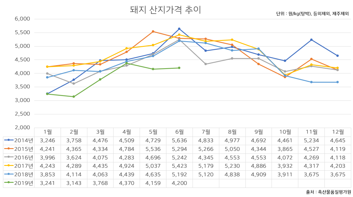 “이제 좀 오를 줄 알았더니…” 한돈농가 당혹 여름 성수기에도 돼지고기 가격은 하락세, 무슨 일이? ASF로 중국, 동남아 등 세계 돼지고기 가격 폭등? 국내 돼지고기엔 영향 없어 국내 재고량 증가, 소비 부진 탓으로 전년 동기대비 산지 및 소매 가격 모두 하락 한돈농가, “신선하고 안전한 여름 보양식 한돈 많이 먹어달라” 전국민에 호소 아프리카돼지열병(ASF)이 중국, 베트남을 넘어 북한까지 번지면서 전세계 돼지고기 가격이 폭등하고 있다는 보도가 연일 이어지고 있다. 세계 최대 돼지고기 소비국인 중국에서 ASF가 확산돼 돼지고기 공급부족 및 가격 급등 우려 확산으로 돼지고기 비축량을 늘리고 있기 때문이다. 실제로 베트남은 이미 280만 마리, 중국은 110만 마리 이상이 폐사 및 살처분 됐으며 지난 5월 중국의 돼지고기 수입량은 18만7459톤으로 지난해 같은 기간보다 63% 급증한 것으로 나타났다. 수입산 돼지고기가 국내 시장의 30% 이상을 차지하고 있는 만큼 우리나라 돼지고기 가격에도 영향을 미칠 것으로 예상됐으나 실상은 그렇지 않다. 돼지가격이 최고가를 기록하는 여름 성수기 시즌임에도 올해는 사상 최저가를 형성하고 있는 것. 축산물품질평가원에 따르면 6월 돼지고기 평균 산지가격은 kg당 4200원으로 전년 같은 기간보다 19% 하락했다. 6월 가격으로는 지난 2008년 이래 가장 낮은 가격이며, 사상 최대 폭락했던 2013년 가격도 올해보단 높았다. 소매가격도 마찬가지로 한국농수산식품유통공사에 따르면 6월 돼지고기 삼겹살(국산냉장.중품) 100g당 평균 가격은 1,936원으로 평년 2,195원을 크게 밑돌았다. 한돈자조금 관계자는 “해외 ASF 영향과 6월 돼지고기 소비 성수기임에도 불구하고 가격하락이 지속되는 이유는 국내 돼지고기 재고량 증가와 극심한 소비부진 때문”이라며, “연초부터 시작된 가격하락이 올 한해 계속 이어질 것으로 보여 한돈농가들은 당혹감을 감추지 못하고 있다”고 설명했다. 실제로 한국육류유통수출협회 국내 전체 재고량 추정 결과 지난해 말 국내 돼지고기 재고량은 총 5만8058톤으로 2017년 말 대비 70% 이상 많은 것으로 나타났다. 한국은행이 발표한 6월 소비자심리지수 또한 두 달 연속 하락한 97.5포인트로 외식 대표 메뉴인 돼지고기 소비부진은 당분간 이어질 전망이다. 한돈자조금 하태식 위원장은 “현재 한돈농가는 ASF위협과 소비위축이라는 이중고를 겪고 있다”며 “한돈농가와 정부가 합심하여 ASF 국내 유입 방지를 위해 최선을 다하고 있으니 신선하고 안전한 여름철 보양식인 한돈을 안심하고 드시길 바란다”고 말했다. ■ 6월 돼지고기 소매가격 및 산지가격