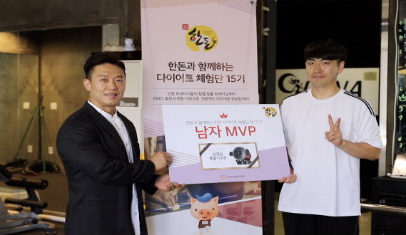 ▲ 한돈 다이어트 체험단 15기 남자 MVP 임정훈 트레이너팀 민경주 님 한돈 명예홍보대사 정국현 대표가 남자MVP를 차지한 임정훈 트레이너팀의 민경주 님에게 시상하는 모습