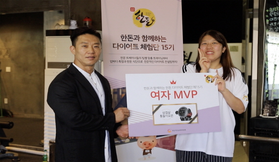 ▲ 한돈 다이어트 체험단 15기 여자 MVP 박수빈 트레이너팀 장의정 님 한돈 명예홍보대사 정국현 대표가 여자MVP를 차지한 박수빈 트레이너팀의 장의정 님에게 시상하는 모습 |