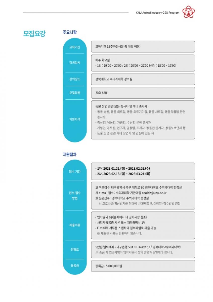 안녕하세요 경북대학교 동물산업최고경영자과정 사무국에서 안내드립니다.
