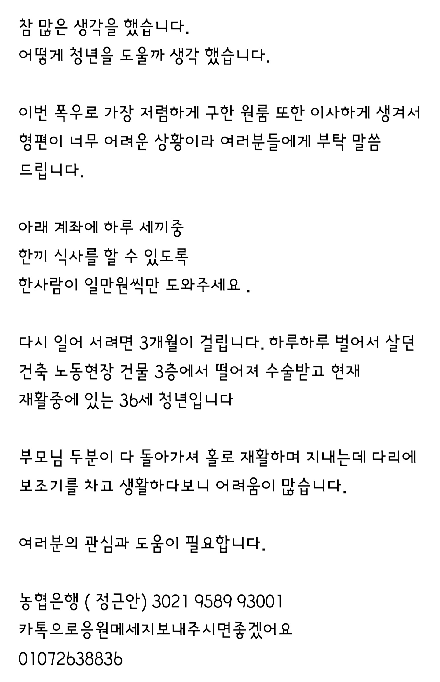 도움이꼭필요합니다.한끼 식사를할수있게 보탬이되어주신다면 재활잘해서 은혜잊지않겠습니다.