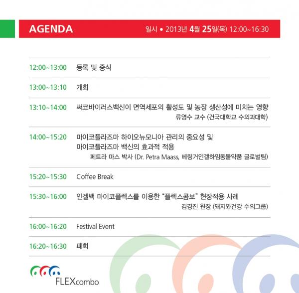 이번 페스티벌에서는 해외 및 국내 전문가들을 모시고 생산성 향상을 위한 주요 질병 관리에 대한 논의가 이루어질 예정이다. 주요 논의 내용은 써코바이러스백신이 면역세포의 활성도 및 농장 생산성에 미치는 영향(건국대 수의과대학 류영수 교수), 마이코플라즈마 백신의 효과적 적용(베링거인겔하임동물약품 글로벌팀 라 마스 박사), 인겔백 마이코플렉스를 이용한 플렉스 콤보 현장적용 사례(돼지와건강 수의그룹 김경진 원장) 등이 포함되어 있다.