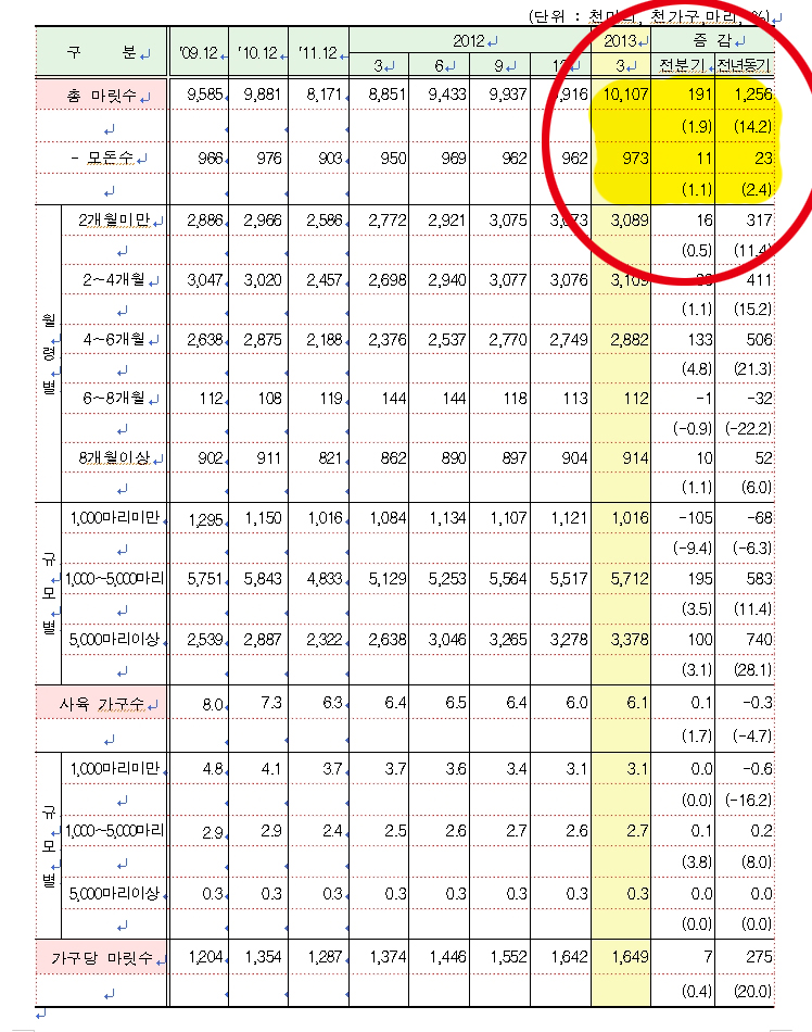 [공지]줄여야 사는데 오히려 사육두수는 늘고 있다! - 통계청 2013년 1분기 가축동향 발표 돼지 사육 마릿수는 1,010만7천마리로 전분기보다 19만1천마리(1.9%) 증가하였으며, 전년동기보다 125만6천마리(14.2%) 증가