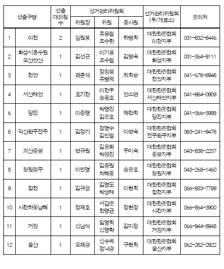 선 거 공 고 한돈자조금 대의원 보궐선거를 아래와 같이 실시코자 공고합니다 - 아 래 - 1. 선출구명 및 선출대의원수 : 12개 선출구 (선출대의원수 : 13명) 2. 선 거 인 : 선거일 공고일 현재 한돈자조금 선거인명부에 등재된 자 3. 선 거 일 : 2013년 6월 17일 ㅇ 선거인명부에 등록되어 있는 양돈업자의 과반수 이상 또는 돼지 마리수의 3분의 2 이상을 사육하는 양돈농가가 투표에 참여하지 않았을 경우에는 선거일 익일에 한하여 선거일을 연장한다. ㅇ 대의원 입후보자수가 해당 선출구에 배정된 대의원수 보다 같거나 적은 경우 투표를 실시하지 아니하고 당선된 것으로 간주한다. 4. 피선거권자 : 선거인명부에 등재된 자 5. 후보등록접수장소 : 각 선출구별 선거관리위원회 (첨부 참조) 6. 투표개시 및 종료시각 : 선거일 오전 9시에서 오후 6시까지 7. 투표소 위치 : 첨부 참조 8. 개표소 위치 : (상동) 9. 후보등록기간 : 2013년 5월 20일부터 2013년 5월 22일까지 ㅇ 공휴일 제외, 매일 오전 9시부터 오후 5시까지 ㅇ 후보등록기간은 공고일 익일부터 3일간으로 하되 선출하여야 할 대의원수보다 후보자수가 적을 경우에는 3일간 연장한다. 10. 등록절차 : 본인 또는 대리인 방문 등록 신청 11. 선거인명부열람 : 2013년 5월 16일부터 2013년 6월 16일까지 (장소 : 각 선출구별 선거관리위원회) 12. 기 타 : 상세한 사항은 각 선출구별 선거관리위원회 또는 한돈자조금 관리위원회에 문의바람 2013년 5월 16일 한 돈 자 조 금 관 리 위 원 장 (인)