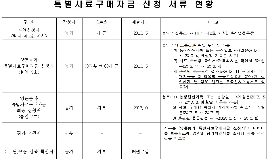 2. 양돈농가는 특별사료구매자금 신청시 사업신청서,  신용조사서와 함께 양돈농가 특별사료구매자금 신청서를 작성하여 한돈협회 전국 각 지부(회)장의 확인을 받은 후에 시군에 신청서를 제출하셔야 합니다.