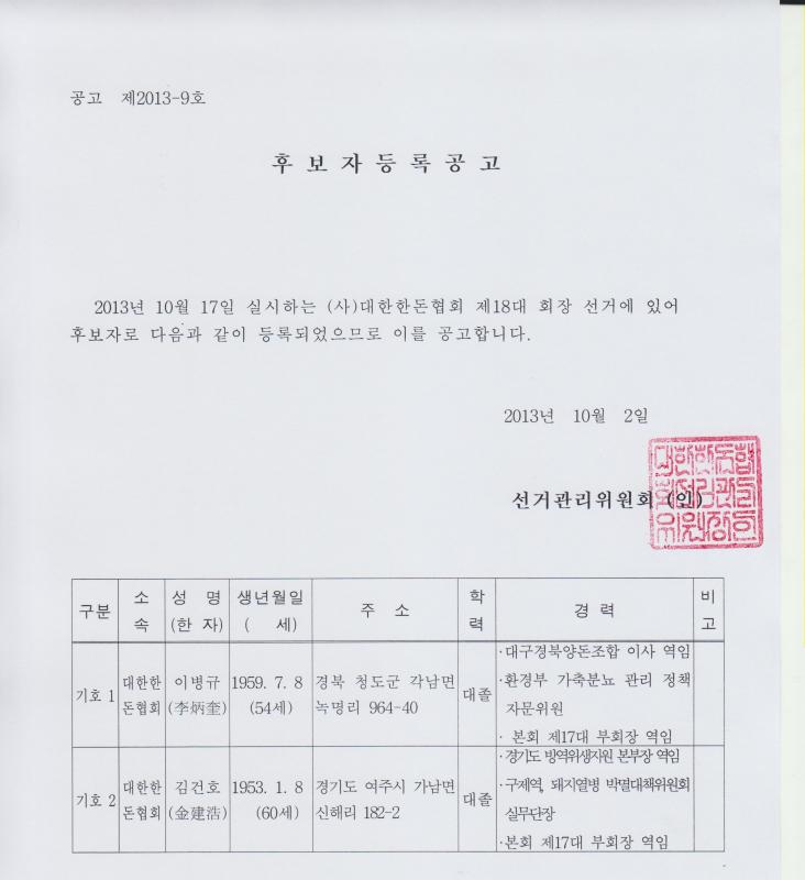 대한한돈협회 제18대 회장선거 후보자 등록 공고