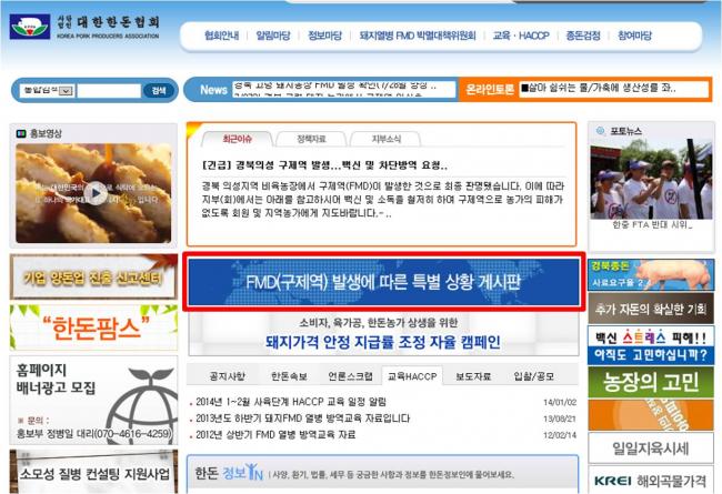 * 접속방법 안내 : 본회 홈페이지 메인화면에 있는 'FMD 발생에 따른 특별 상황 게시판' 배너를 클릭하면 이동합니다.