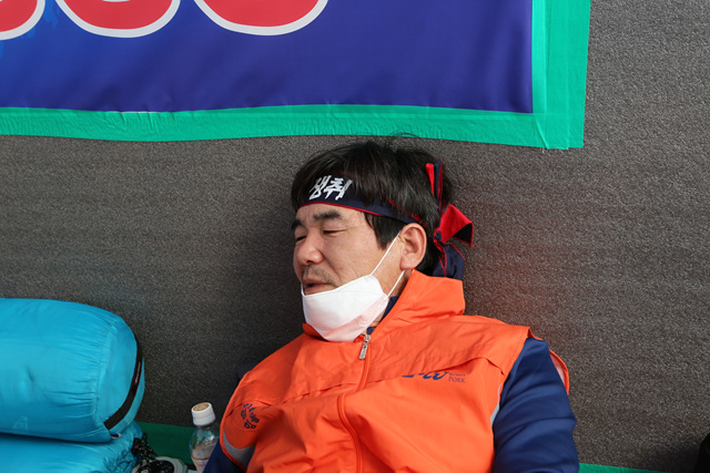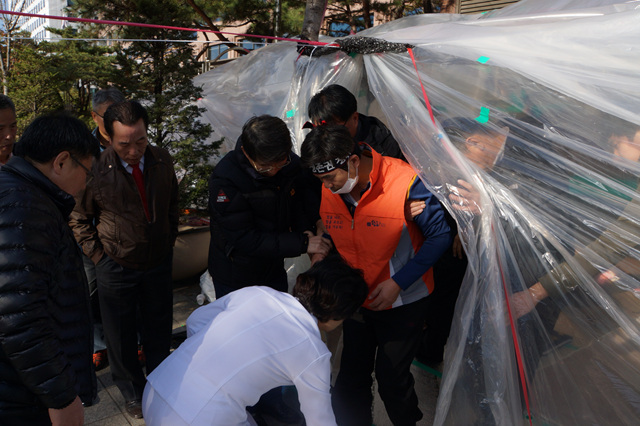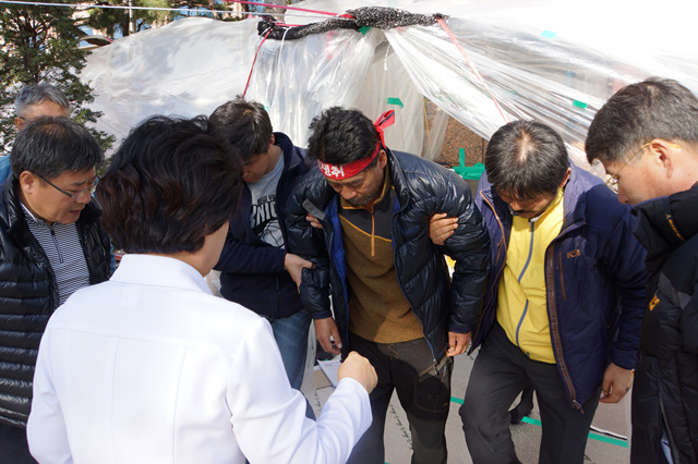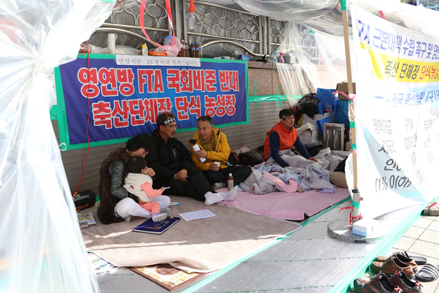 때이른 매서운 한파도 우리의 투쟁은 결코 멈출 수 없다. 축산업 생존권 확보를 위한 축산단체장들의 목숨을 건 단식투쟁이 금일로 12일을 맞이했다. 매서운 강추위가 칼 바람속에 에일 듯 온몸을 파고들며, 온 몸을 얼어붙게 하지만 결코 물러설 수 없고, 멈출 수 없는 생존권 투쟁이다. 단식투쟁 12일째를 맞은 단체장들은 육체적으로는 농성장에 찾아온 축산농가들과 이야기할 기력조차 남아 있지 않은 상황에 몰려 오늘 오후 3시 이병규 한돈협회장, 이창호 축단협회장 등이 병원으로 후송되어 긴급 응급진료를 받았다. 이날 진료를 담당한 의사는 축산단체장들의 혈압상태는 다행히 양호하나 기력쇠진으로 쇼크가 우려된다며, 단식중단을 권유했다. 그러나 이병규 회장을 비롯한 단체장들은 축산업 생존권 확보를 위한 9대 요구사항 이행을 촉구하며, 25만 축산동지의 뜨거운 성원과 지지에 힘입어 단식투쟁을 지속할 뜻임을 분명히 했다. [대한한돈협회 2014. 11. 3] |
